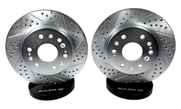 Baer Claw performance rotors are a great way to improve your vehicles braking performance and overall appearance. The kit includes a pair of direct replacement rotors with a cross-drilled and slotted friction surface that allows an escape route for the gasses and dust that form between the pad and rotor during braking providing a more consistent pedal feel and reduced brake fade. Each pair of rotors are zinc-plated providing a brilliant finish behind open center wheels.